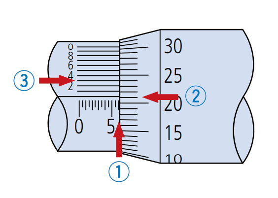 帶游標刻度的千分尺在套管基線的上面有游標刻度,此時的讀數方法如下圖所示: