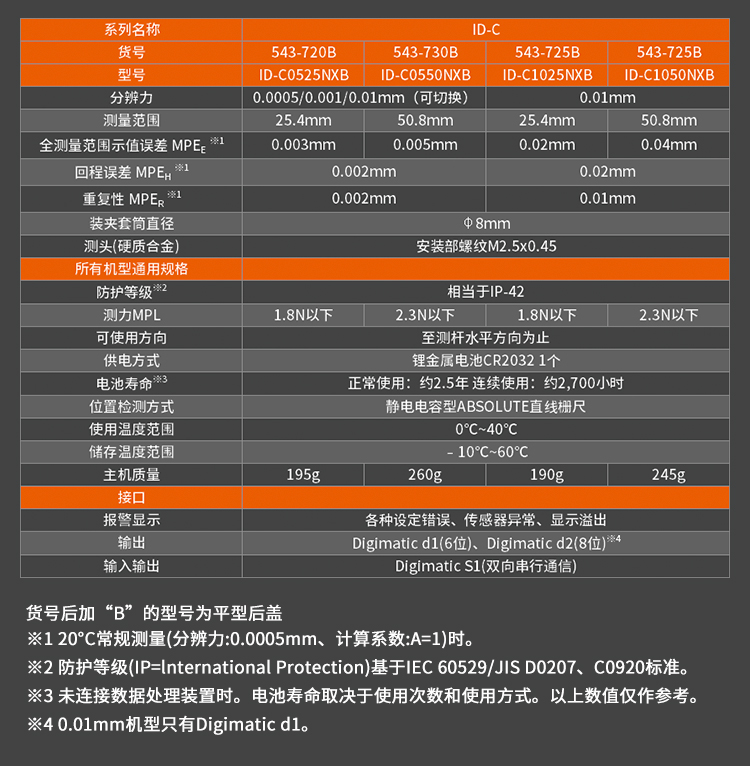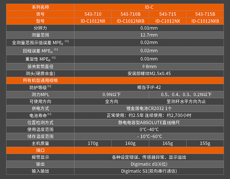 • 543-794/94B的塵/水防護等級達到IP53 (只限分辨力0.001mm型),使用紐扣式電池(SR44)。